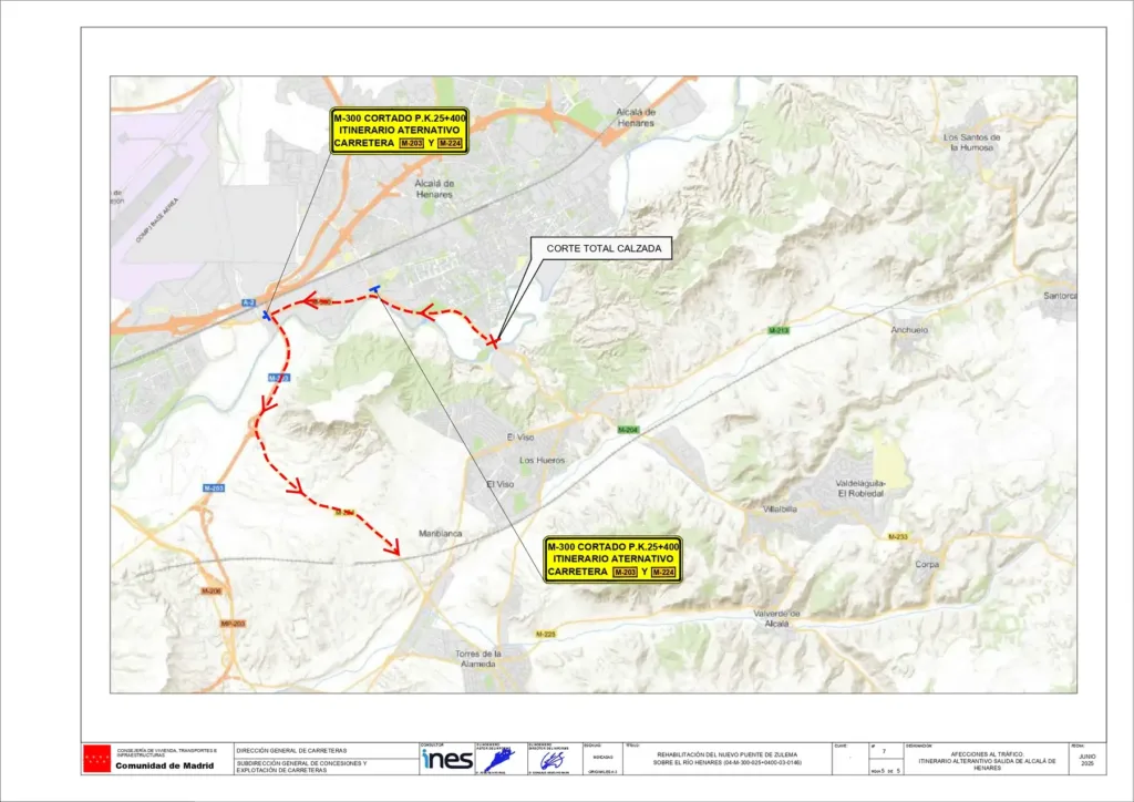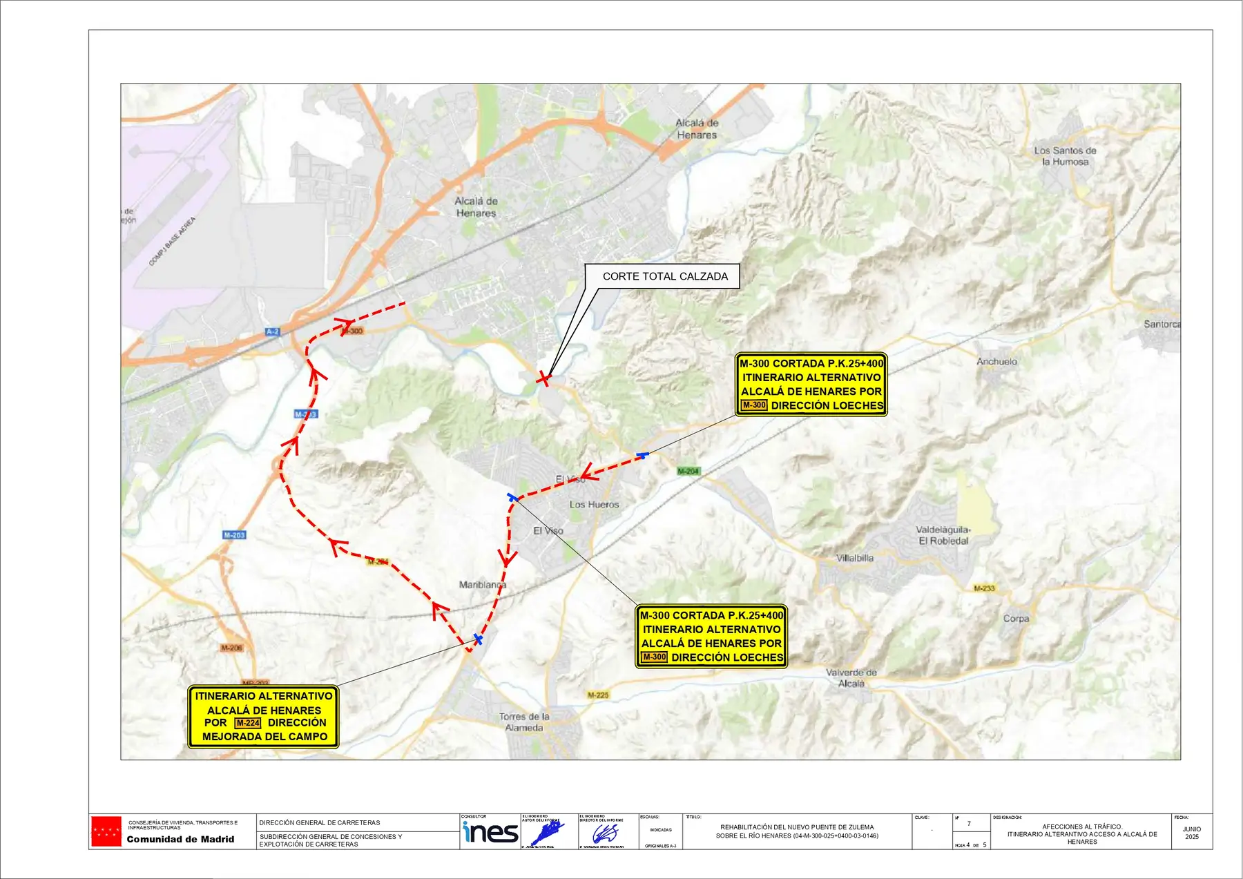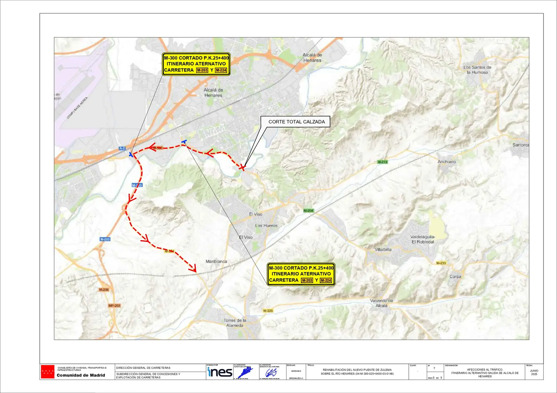 La Policía Local informa que, a partir del 6 de octubre, la M-300 a su paso por Alcalá de Henares permanecerá cerrada al tráfico a la altura del puente Zulema,