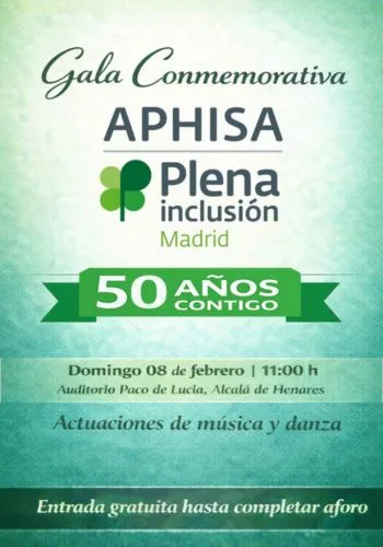 La gala será un espacio de encuentro para conmemorar el 50 aniversario de APHISA, la Asociación de Alcalá de Henares para personas con discapacidad intelectual. Durante el acto se desarrollarán diferentes actuaciones de música y danza, pensadas para emocionar y compartir, reflejo del talento, el esfuerzo y la ilusión de las personas que forman parte de APHISA.