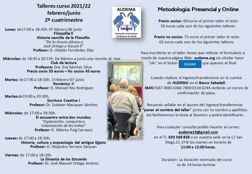 La Asociación Universitaria de Mayores de Alcalá AUDEMA nos remite esta información de convocatoria de nuevos talleres para este segundo cuatrimestre del año por si resulta de vuestro interés