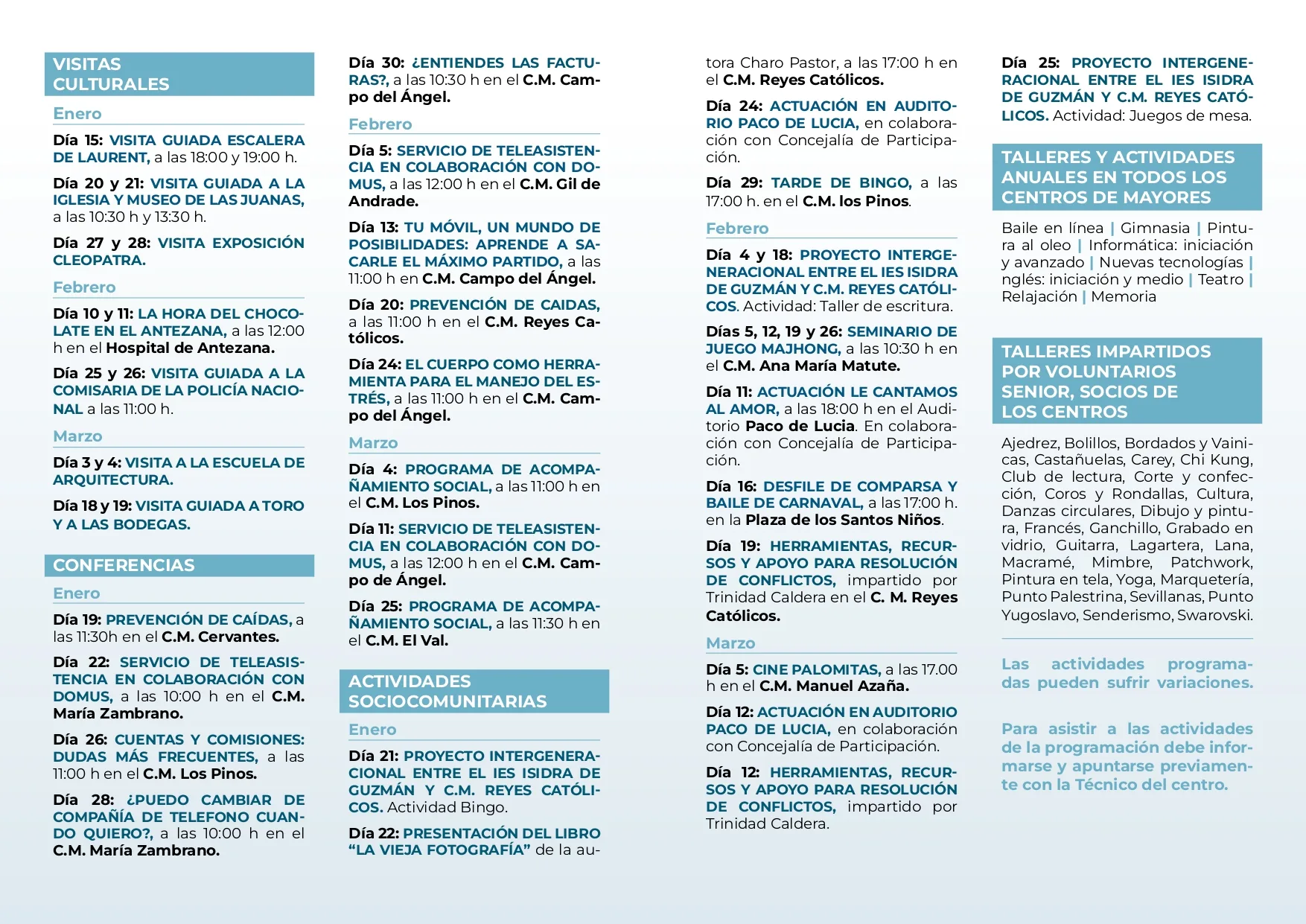 La Concejalía recuerda que para participar en cualquiera de las actividades es necesario informarse y realizar la inscripción previa con la Técnico del centro correspondiente, ya que la programación podría sufrir variaciones.