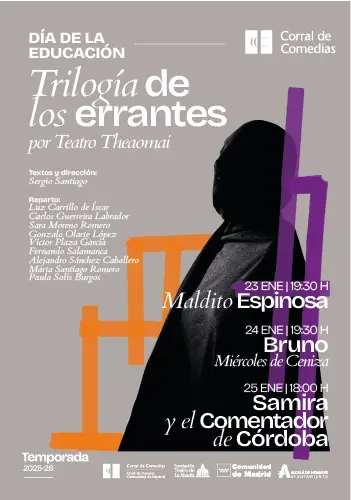 Tras haber estrenado estos tres espectáculos, en temporadas anteriores, en el escenario del Corral, la joven compañía Theaomai los muestra por primera vez de manera consecutiva, durante un fin de semana, en el formato de trilogía con que originalmente los concibiera su autor y director Sergio Santiago. Los tres títulos escogen como ejes a figuras del pensamiento que se opusieron, con sus modelos panteístas, a las tres grandes religiones de libro: Baruch Szpinoza (judaísmo), Giordano Bruno (cristianismo) y Averroes (islam).