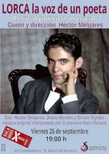 Homenaje a la vida y obra de Federico García Lorca, a través de un recital poético-musical que explora el legado de este icónico poeta. Con las voces de Héctor Melgares, Jesús Morales y Miriam Tejedor y la música original interpretada por la pianista Maru Mararia
