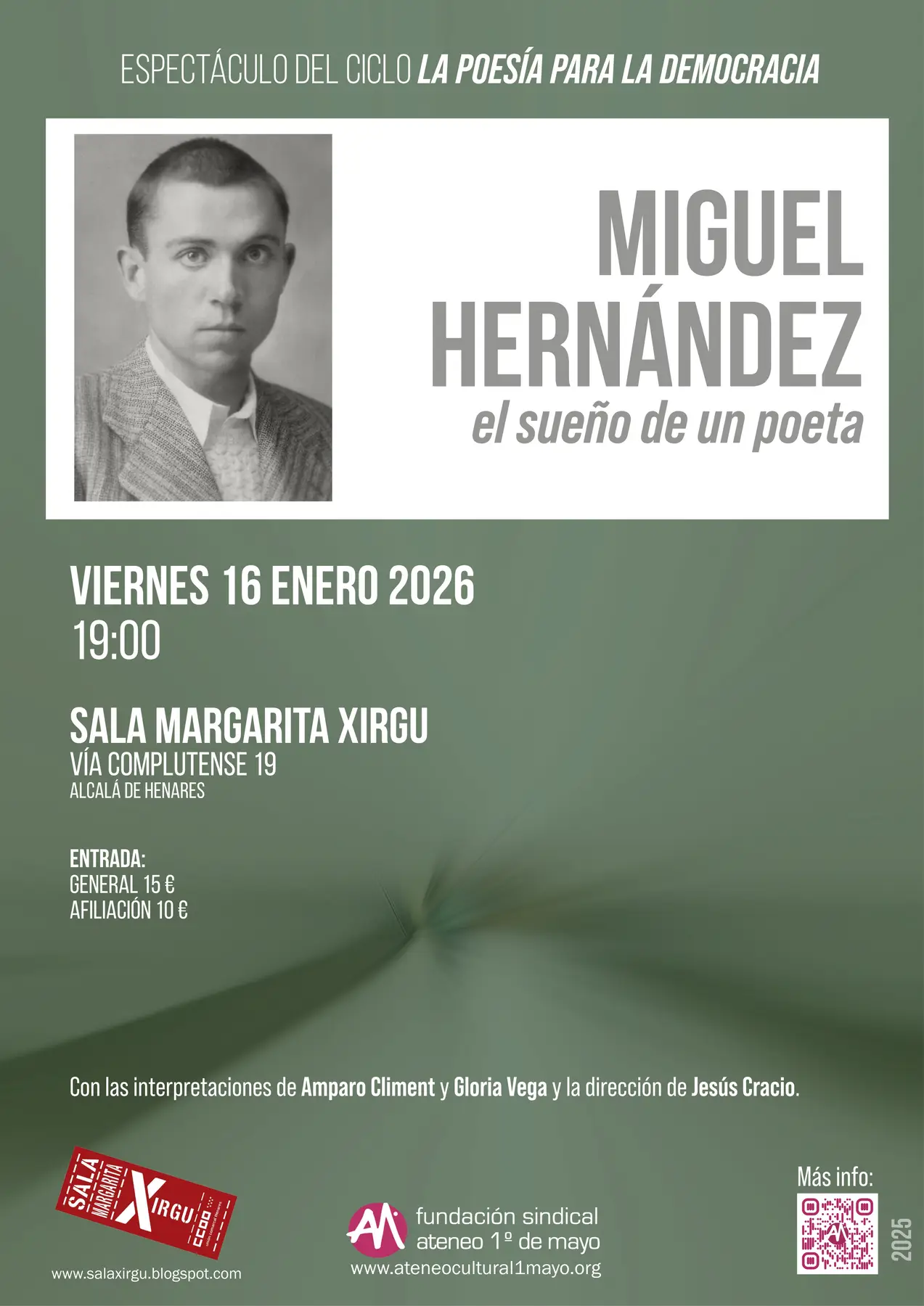 - Viernes 16 a las 19h POESÍA PARA LA DEMOCRACIA. Recital poético-teatral. MIGUEL HÉRNANDEZ el sueño de un poeta en la Sala Margarita Xirgu