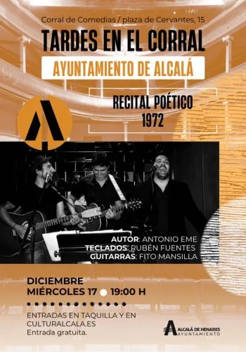 El poeta Antonio eMe presenta 1972, una obra profundamente íntima, honesta y humana, acompañada por la música en directo de Rubén Fuentes y Fito Mansilla, que aportan atmósferas sonoras cargadas de emoción al recital. Este espectáculo es un viaje poético y biográfico, donde el autor revisita su niñez en un barrio humilde, la juventud marcada por los sueños y la rebeldía, y la madurez atravesada por el desencanto, la pérdida y la aceptación. Con un lenguaje directo y evocador, Antonio eMe se convierte en narrador de su propia vida, retratando la realidad de quienes crecieron en los años 70: juegos en la calle, primeras amistades, amores que dejan huella y las cicatrices que imprime el paso del tiempo. 1972 aborda temas universales como la soledad, el amor no correspondido, la rutina, la lucha diaria y la necesidad de transformar el dolor en poesía, mezclando nostalgia, ironía y una mirada crítica hacia uno mismo y el mundo. Es un recital que no solo se escucha: se vive. Junto a los poemas de su nuevo libro, el autor recupera también algunos de los versos más queridos de sus obras anteriores, El Café del Loco y Los pétalos pares de las margaritas, despertando emociones que muchos creíamos olvidadas. ENTRADA GRATUITA (recoger en el Teatro Salón Cervantes o en culturalcala)